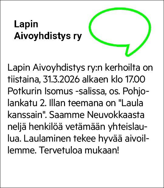 Lapin Aivoyhdistys ry VIIKKO-OHJELMAT kevät 2026 KERHOILLAT: Potkurin Isomus-salissa, Pohjolankatu 2, joka parillinen tiistai, klo 17-20 alkaen 20.1., 3.2.,17.2., 3.3., 17.3., 31.3., 14.4.,…